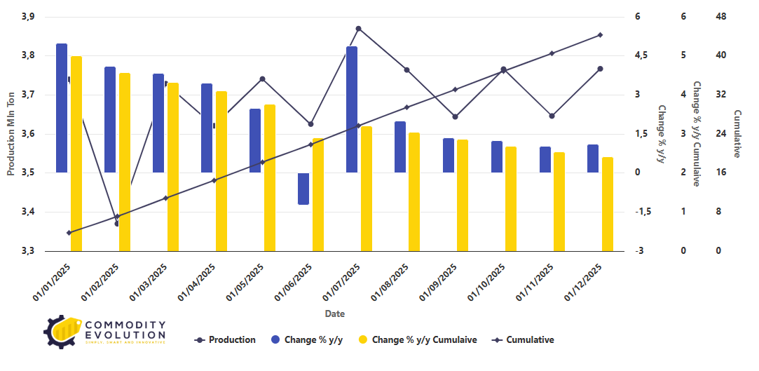 Guardando al 2026, la dinamica cambia in modo significativo. La crescita della produzione domestica è destinata a rallentare ulteriormente man mano che il sistema si avvicina al tetto regolamentare dei 45 milioni di tonnellate, mentre anche il contributo delle importazioni appare incerto. I progetti esteri, in particolare in Indonesia, procedono con lentezza a causa dei vincoli energetici, mentre in Europa e Nord America i costi dell’elettricità continuano a minacciare la stabilità produttiva.