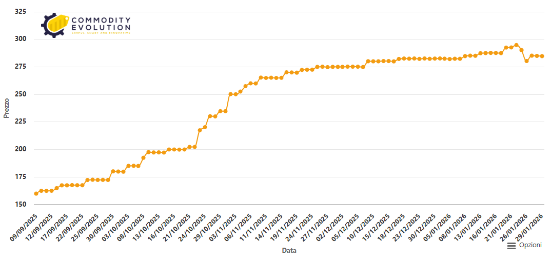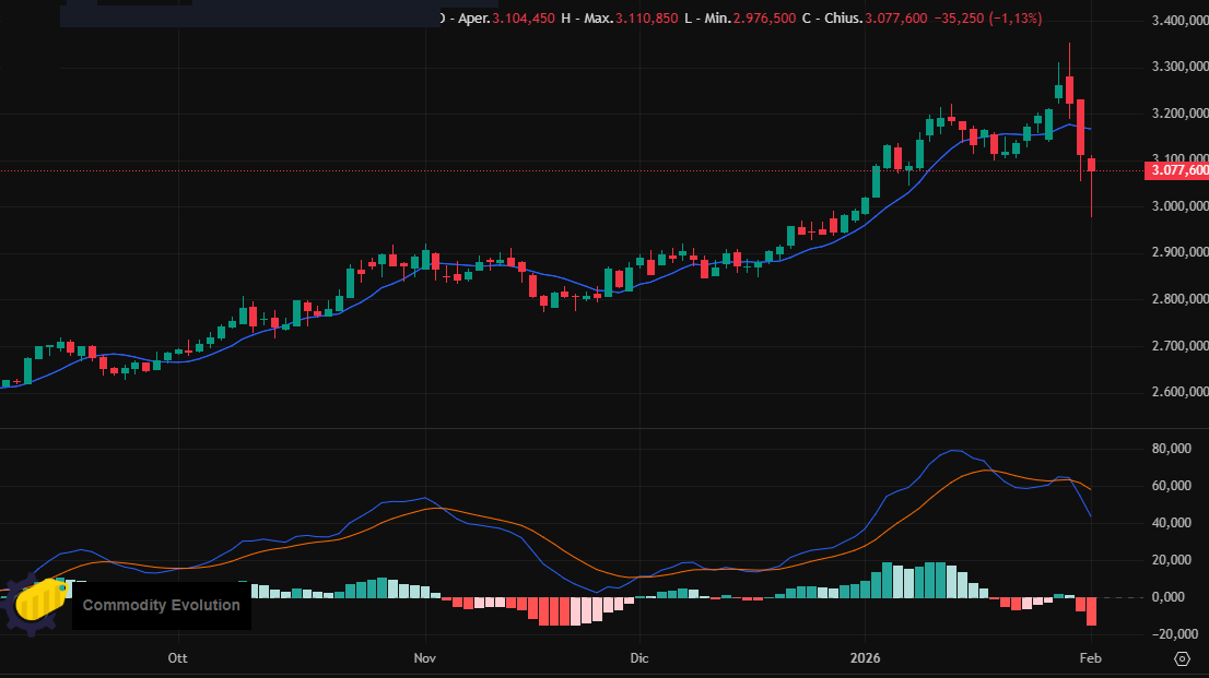 Il ritorno verso area 3.050 $/t, dove si collocano le ultime chiusure, rappresenta ora un passaggio chiave. Questa zona coincide con un primo livello di supporto dinamico, oltre che con un’area in cui il mercato aveva precedentemente consolidato prima dell’ultima gamba rialzista. La reazione dei prezzi su questi livelli sarà determinante per definire il tono di febbraio.
