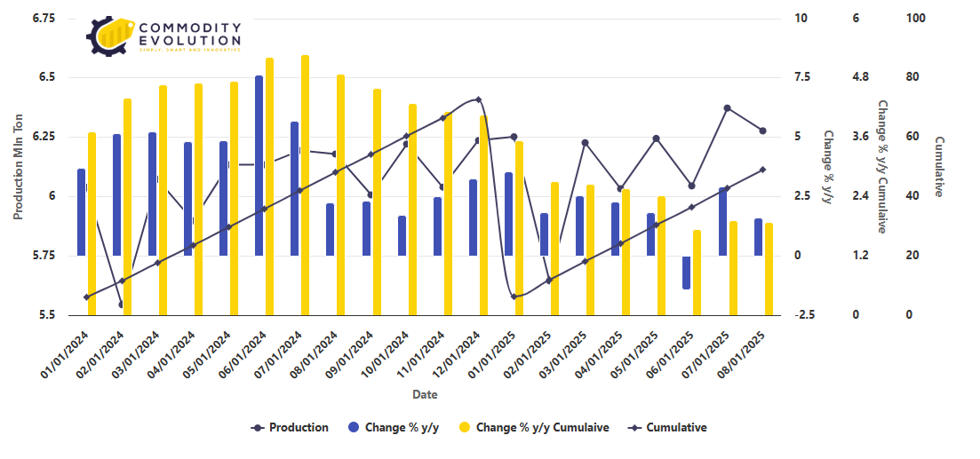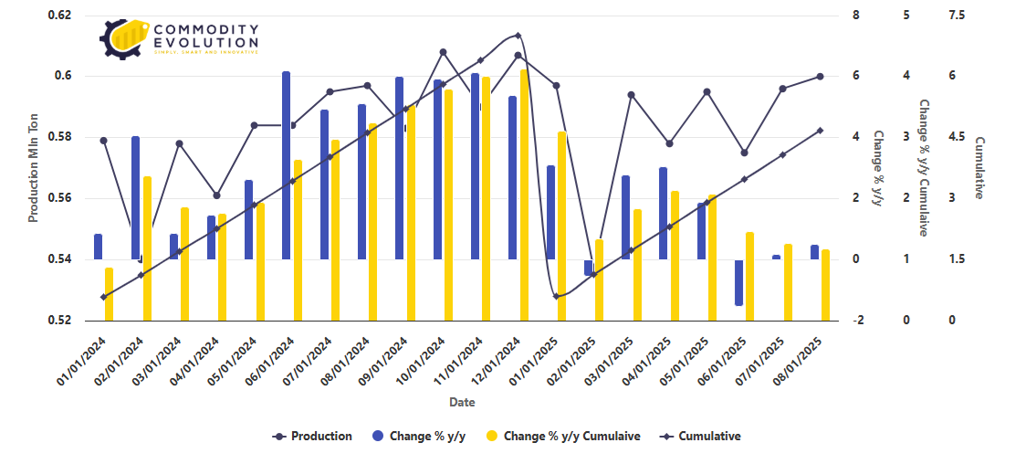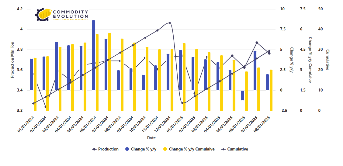 In America Latina, la produzione è scesa a 132.000 tonnellate (-1,5% rispetto a luglio), segnalando un freno inatteso. La Cina, invece, ha registrato 3,764 milioni di tonnellate, sostanzialmente stabili su base mensile ma con un +3,26% rispetto a giugno, dopo la contrazione di inizio estate.