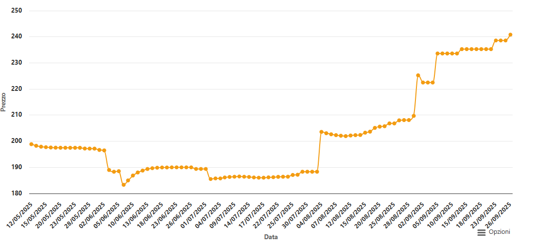L’analisi tecnica offre alcuni spunti chiave. La media mobile breve resta inclinata positivamente, mentre l’indicatore MACD – pur ridimensionato rispetto ai picchi estivi – mantiene un’impostazione neutrale-rialzista, suggerendo che la pressione ribassista è al momento contenuta.