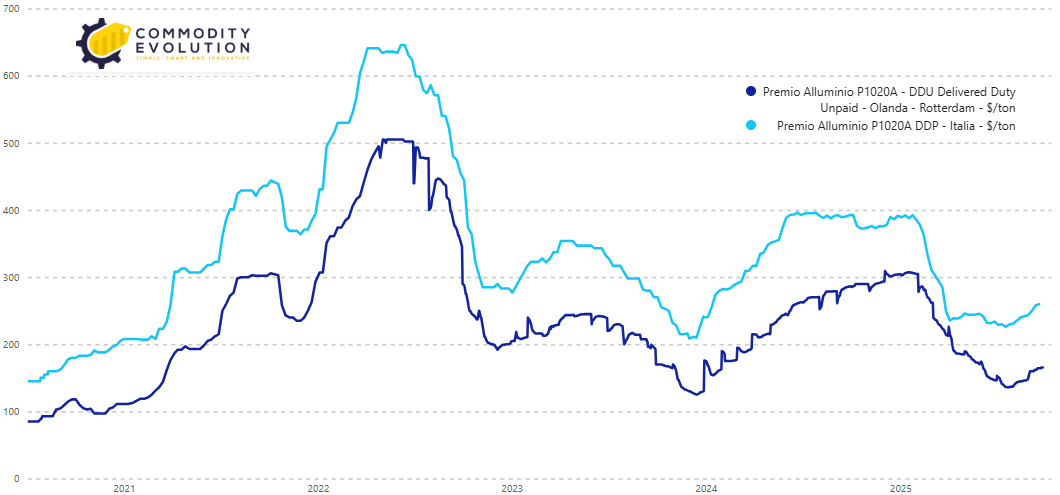 Premio Alluminio P1020A DDU Rotterdam VS P1020A DDP Italia $/ton – Powered by Commodity Evolution