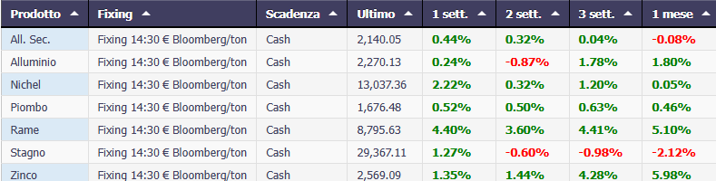In euro, il quadro è pressoché speculare. Anche qui, lo zinco ha guidato i rialzi con un +5,98% su base mensile, seguito dal rame (+5,10%) e dal piombo (+0,46%). L’alluminio ha chiuso in progresso dell’1,80%, mentre il nichel ha mantenuto un andamento stabile (+0,05%). Lo stagno, al contrario, ha sofferto una contrazione del -2,12%, confermando le difficoltà già emerse nelle quotazioni in dollari.